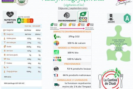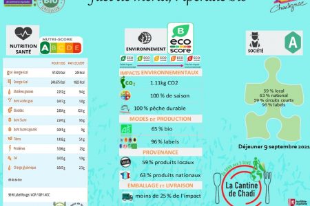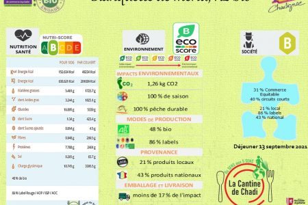 Santé - environnementBilans quotidiens environnementaux, nutritionnels des plats servis à la Cantine de Chadi (mardi 7 sept 2021)(lycée Saintes, AgroCampus de Saintonge) par jean-philippe jean-philippe.mouliniermis à jour le 31 août 202130 août 2021