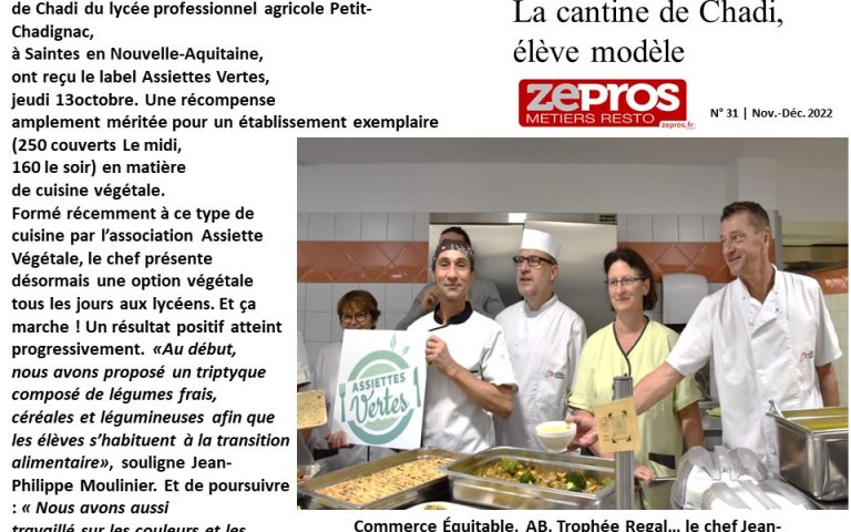 Presse« La Cantine de Chadi, élève modèle » ZEPROS RESTAURATION (nov 2022) Label ASSIETTES VEGETALES (cliquer sur le lien)