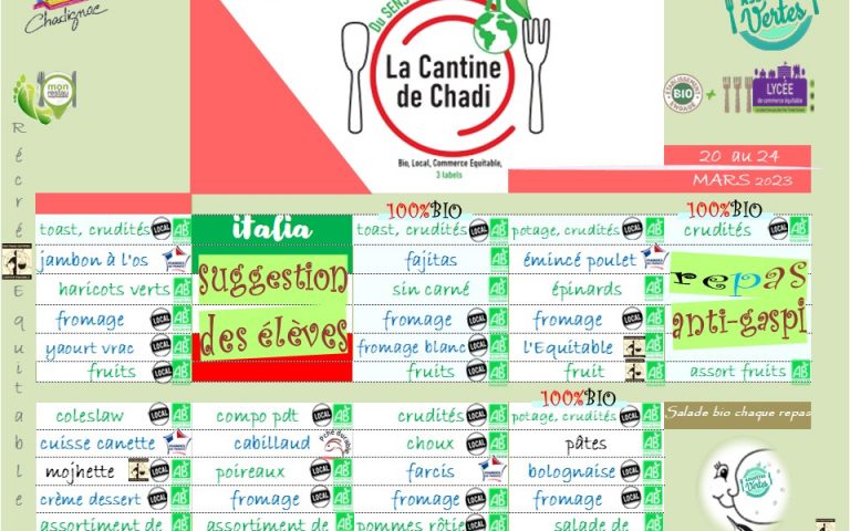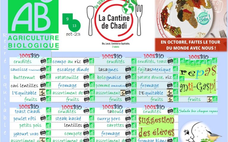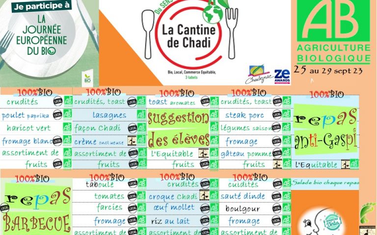 Menus 18 au 22 septembre 2023 (Cantine Bio, Locale, Commerce Equitable)Nouvelle-Aquitaine